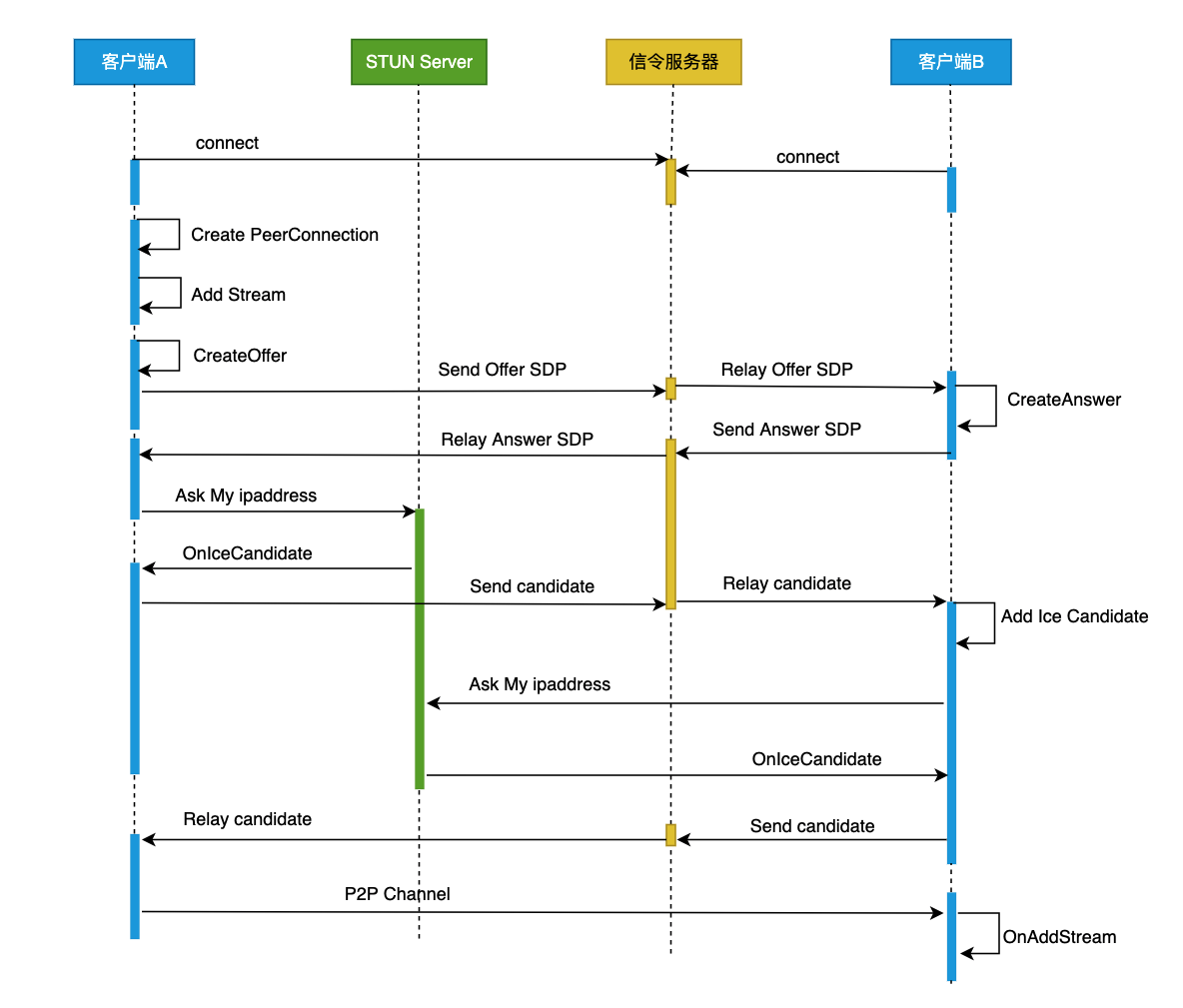 RTCPeerConnection 作为创建点对点连接的 API,是我们实现音视频实时通信的关键。在点对点通信的过程中,需要交换一系列信息,通常这一过程叫做 — 信令(signaling)。在信令阶段需要完成的任务: